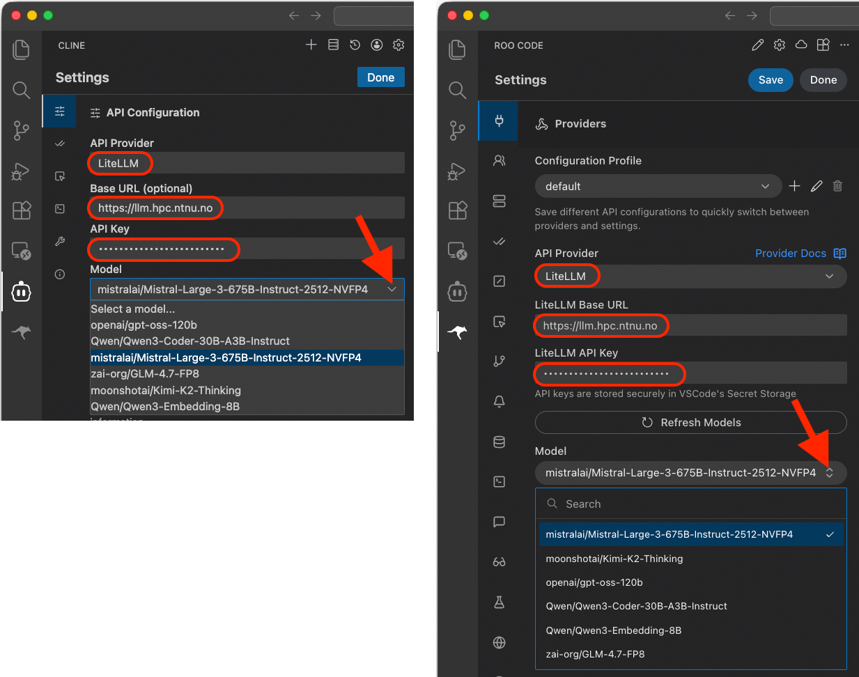 NOTE 2: You can use API Provider "Open API compatible" or "LiteLLM". In most cases they are the same. But for example with Mistral Large 3 in Roo Code "Open API compatible" provider shows sometimes errors. This can be fixed in the next Roo Code update release.